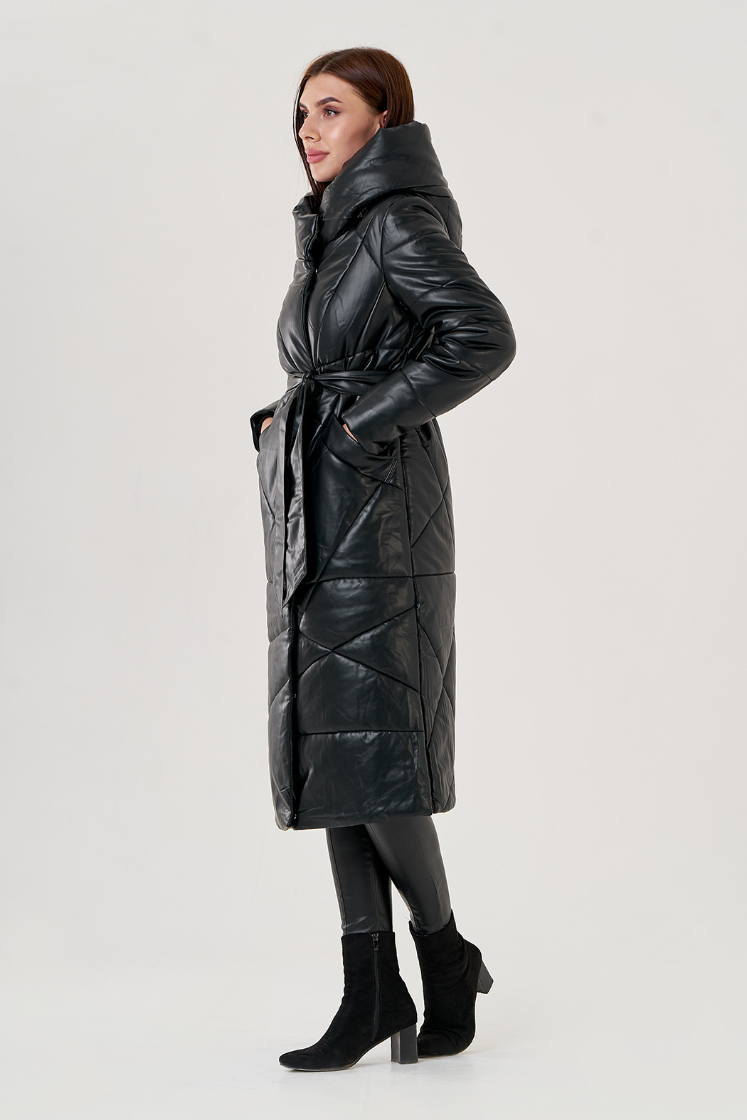 Пуховое пальто из эко кожи будет радовать вас осенью и зимой. Изделие из водонепроницаемого материала. Утеплитель - верблюжья шерсть. Объемный капюшон заменит шапку и укроет от ветра. Застегивается на молнию и кнопки, также есть пояс.